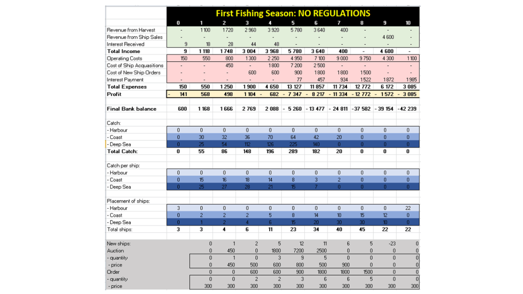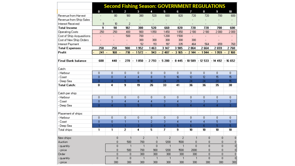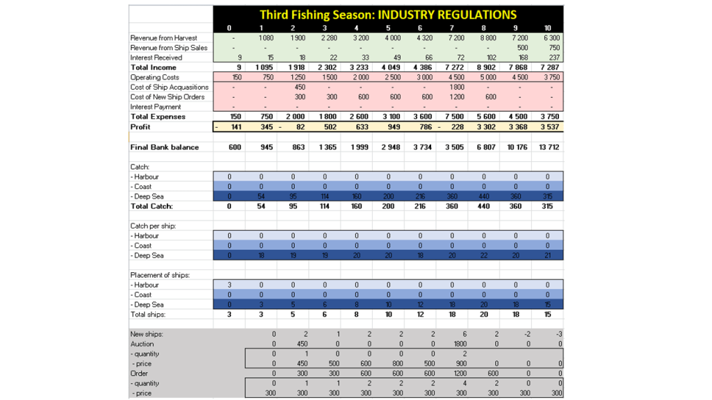 When looking at the total maximum income, it is the highest with industry regulations, and the lowest with government regulations. The final profit is also the highest with industry regulations, at R3537 and the lowest with no regulations, at -R3085. The final bank balance is the highest in industry regulations with R13712, and has a negative balance in the first and second fishing season. By looking at the total highest catch, it can once again be seen that the highest catch is in the fishing season with the industry regulations in place, with 440. This can be due to the fact that industry regulations have given the fish time to reproduce and thus there were ample fish to be caught in the last months of the fishing season.