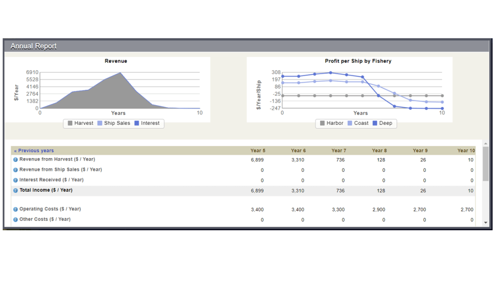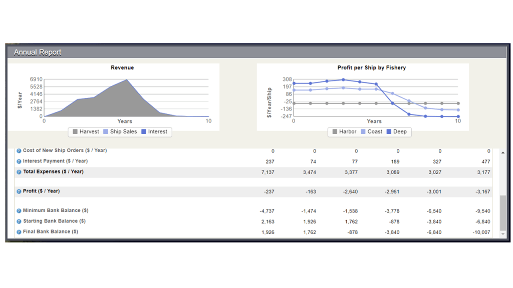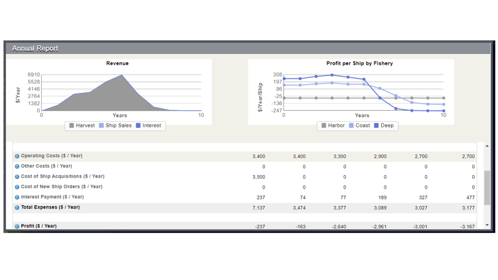 Resource depletion is bad for Anchor management self because restrictions that is put in place by the government effects Anchor Management’s revenue from harvesting anchovy. Our fishing season is for 10 months and that will be restricted to 2 months. For most of the months more than 10 ships are out harvesting and will now be restricted to only 10 ships. Anchor management will not be able to provide to their two customers as much anchovies as usual. This leads to a decrease in anchovy products and less anchovy will be available to businesses and households. The economy as a whole will be affected by the increasing prices because of the decrease in availability of anchovies. As seen below in our annual reports after our first fishing trip, the fact that all the involved fishing companies over fished led to a decrease in resources and thus a substantial amount of revenue was lost. This could lead to Anchor Management going bankrupt and is thus not at all good for business. It also has an effect on society as consumers will no longer be able to enjoy consuming fish as there will be no fish left. Future generations will not be able to see or enjoy these resources due to companies’ negligence.